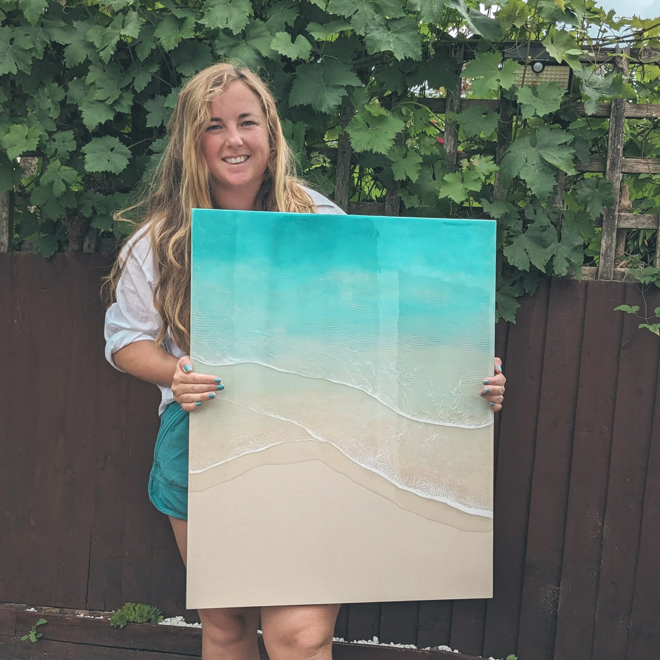 Epoxy resin is a two part liquid that when combined turns hard. During the curing process you can create effects such as cells and lacing to replicate waves.