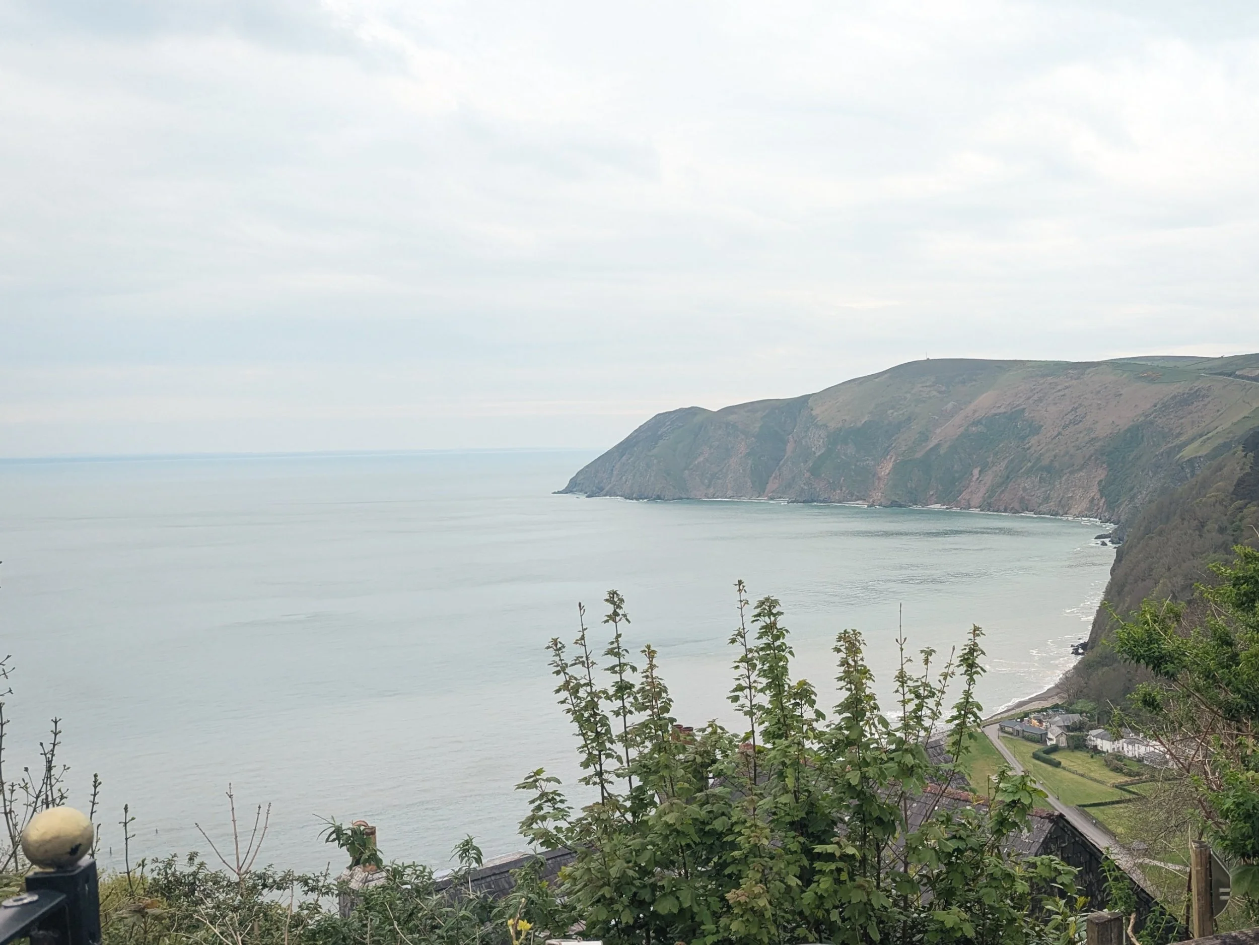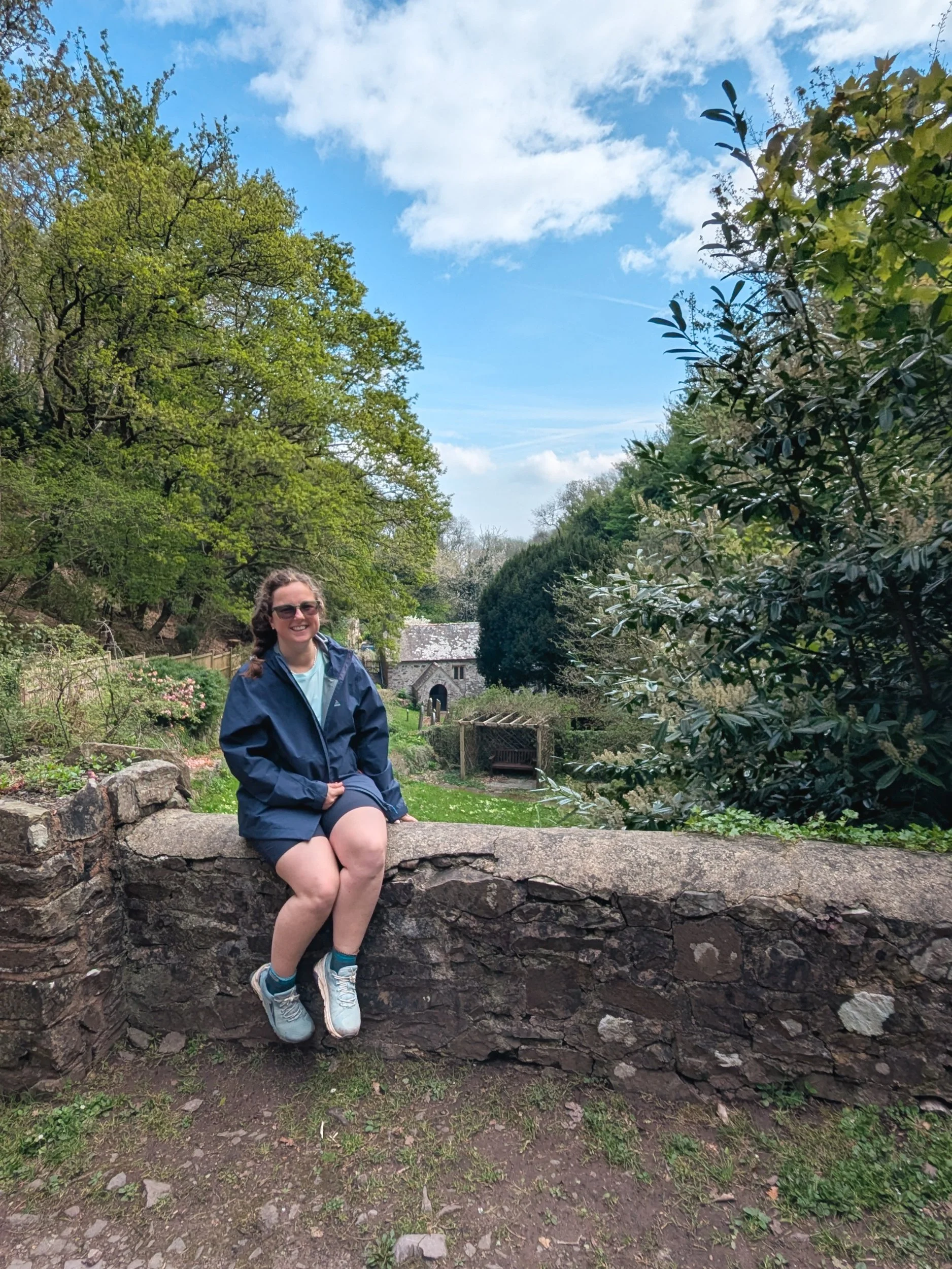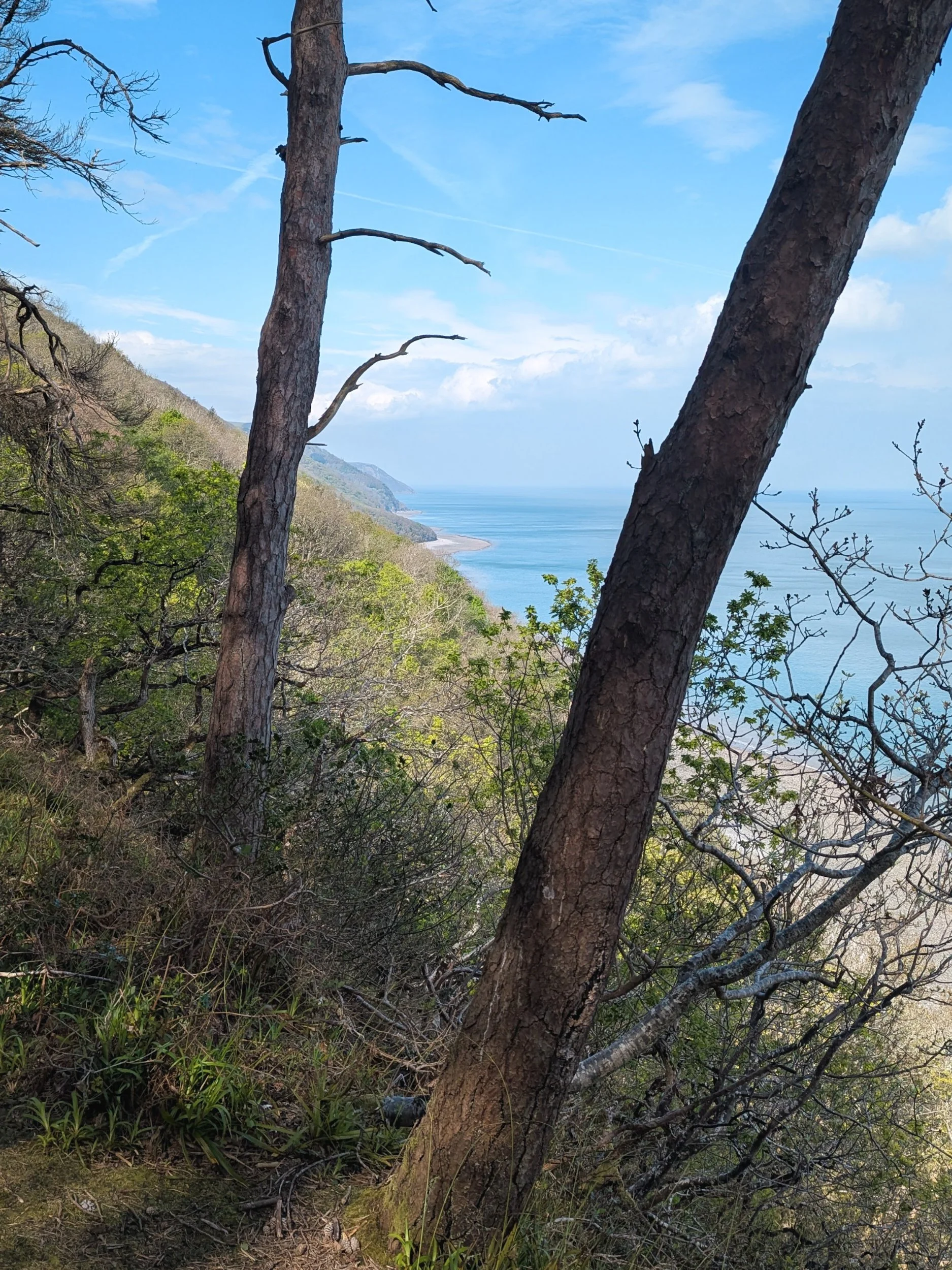 Up a ginormous hill and the landscape changed again. We rounded the corner onto a coastal view and finally lynmouth was in sight! I admit it was miles away!! My feet were so tired, definitely flagging after a long hard day. The view was amazing and we stopped to rest on a bench (found a mini Easter egg on the bench, which was a delight!). We traversed across the edge of a very steep gradient (not one if you've got vertigo!), down down down we went. Past an old gun turret site and to a road for a stretch, before entering some woods with beautiful flowers and tree with places engraved. Unfortunately we didn't have the time or patience to write Wellington!