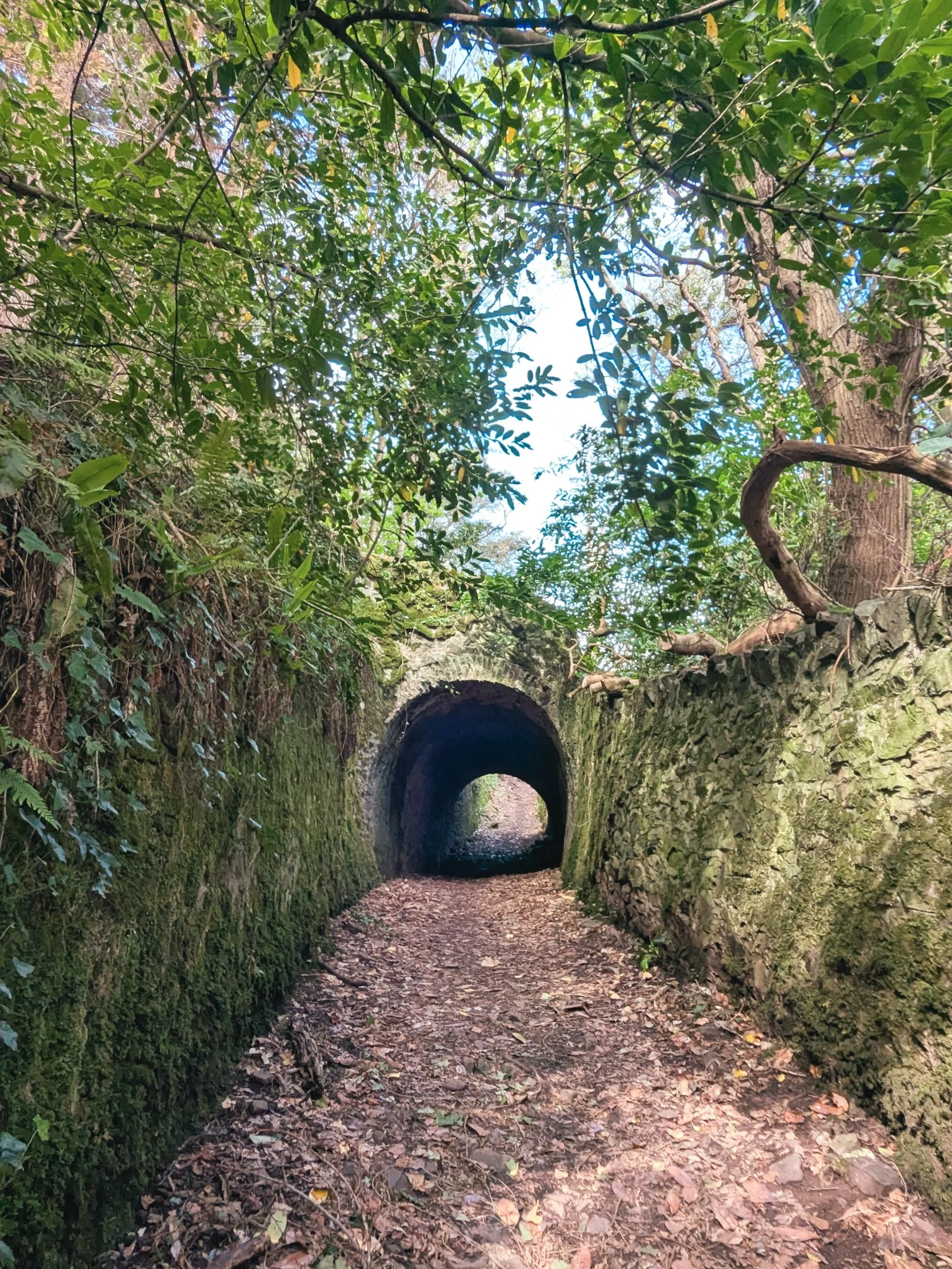 Feeling slightly rested, we continued on, dropping steeply down only to rise up again. The wooded area was tough going and felt hard. Not much changed with the scenery, but a few things to note, we went under some cool old bridges and there was a curved wall almost like a half pipe! Further on there was an arch way to go through.
