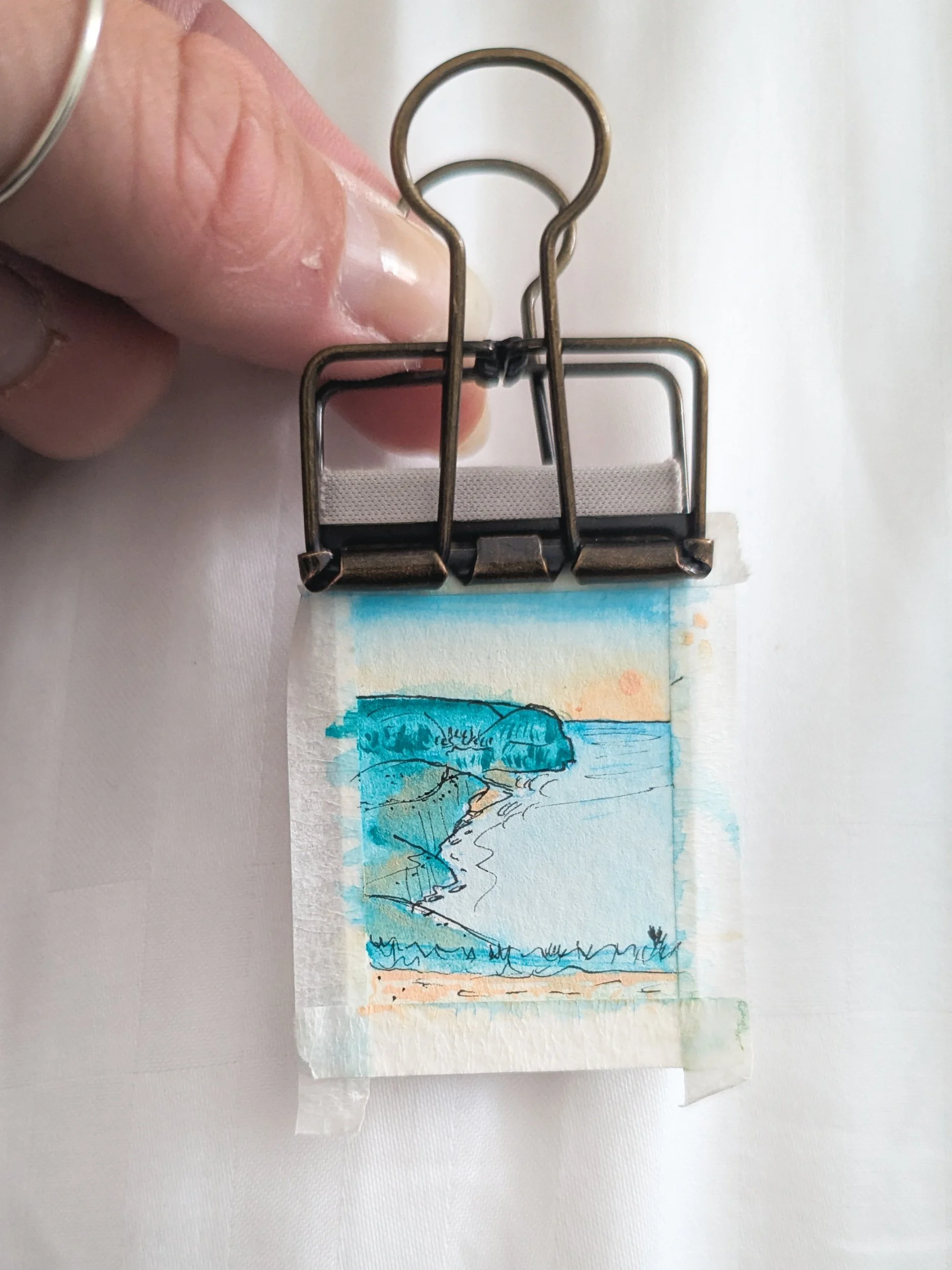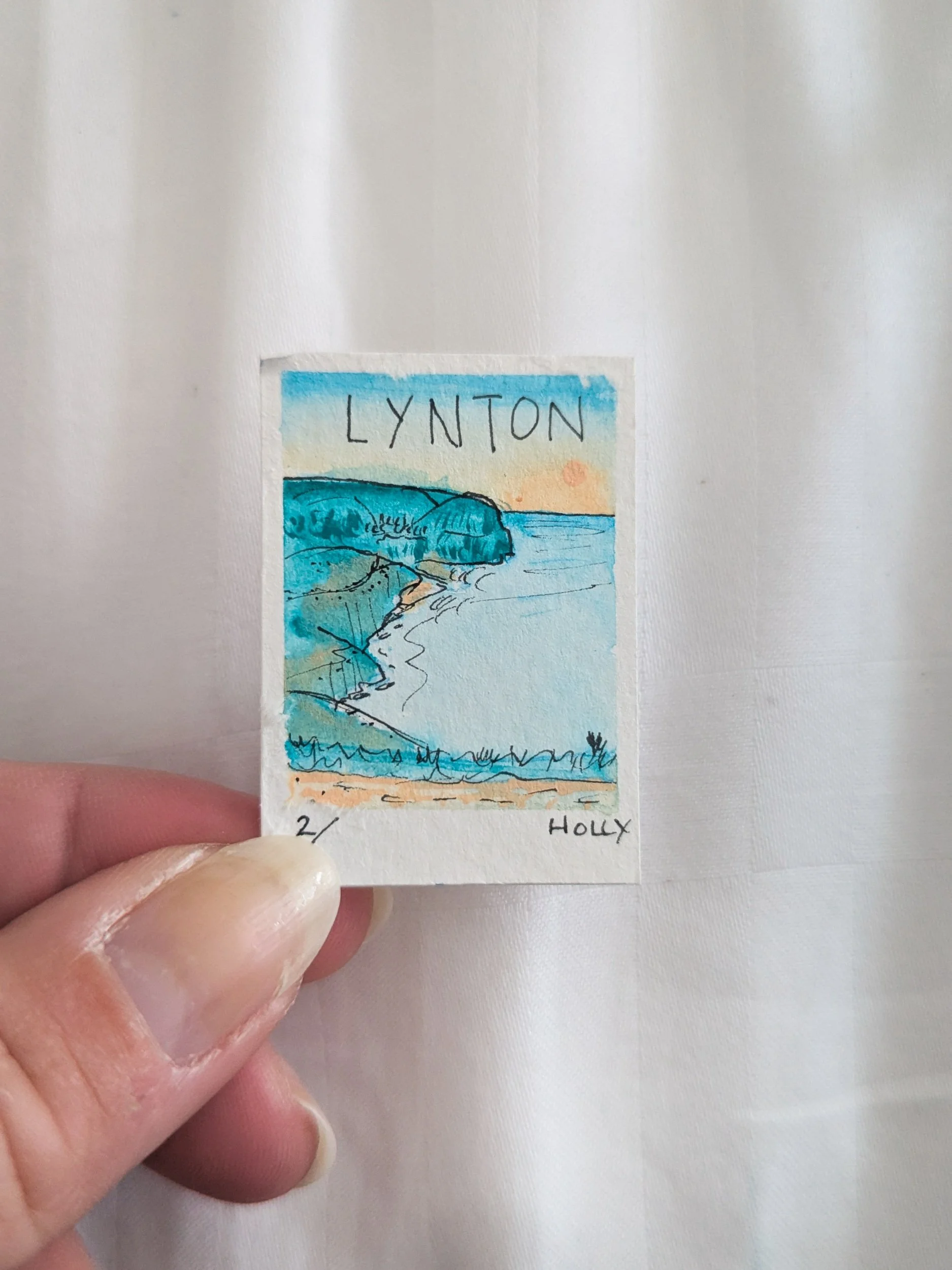 Sketch of the day, capturing the high cliffs and curving waves into Lynmouth, Lynton nestled in the hills above.